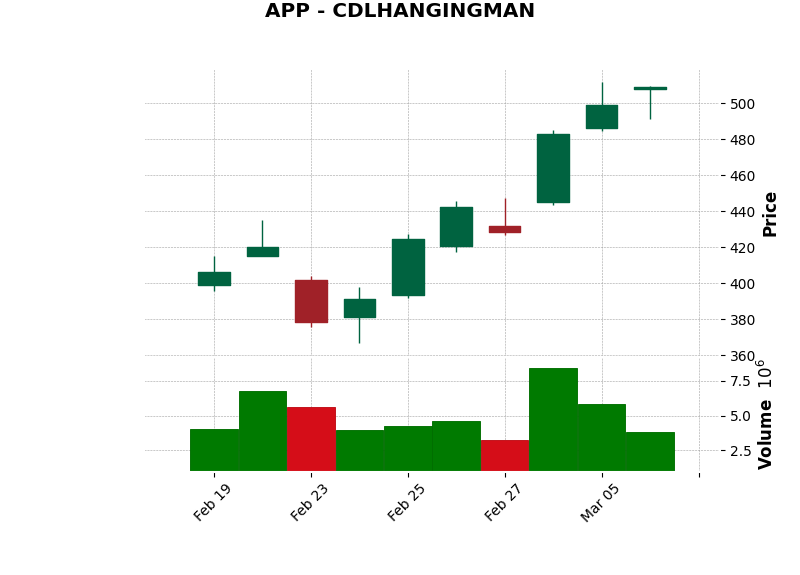 | APP | CDLHANGINGMAN | Bearish | Hanging Man: Bearish reversal. | Sell stock | View Chart |