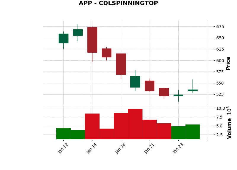 | APP | CDLSPINNINGTOP | Bullish | Spinning Top: Indicates indecision. | Watch closely | View Chart |