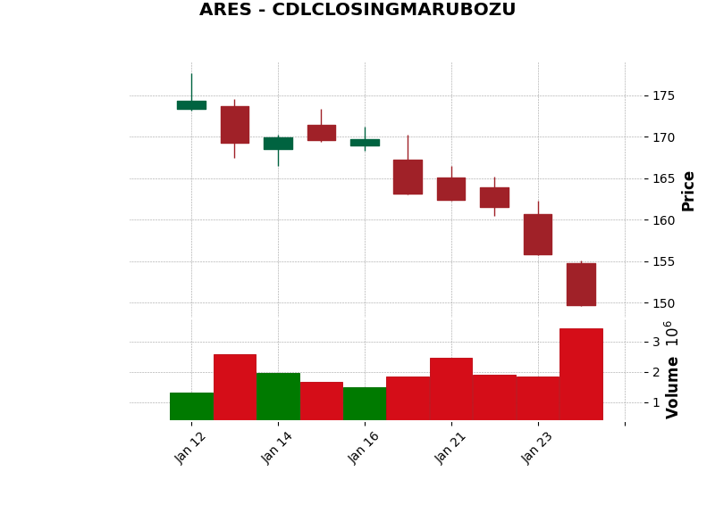 | ARES | CDLCLOSINGMARUBOZU | Bearish | Closing Marubozu: Continuation pattern. | Hold stock | View Chart |