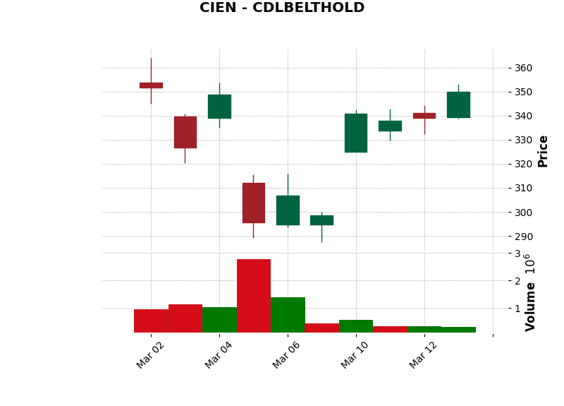 | CIEN | CDLBELTHOLD | Bullish | Belt-hold: Trend reversal pattern. | Watch closely | View Chart |