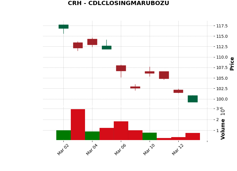 | CRH | CDLCLOSINGMARUBOZU | Bullish | Closing Marubozu: Continuation pattern. | Hold stock | View Chart |