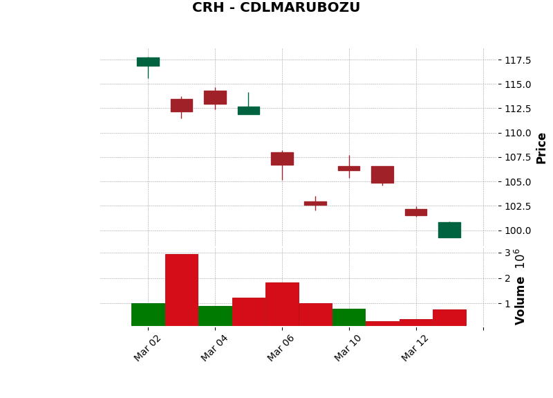 | CRH | CDLMARUBOZU | Bullish | Marubozu: Strong continuation. | Hold stock | View Chart |