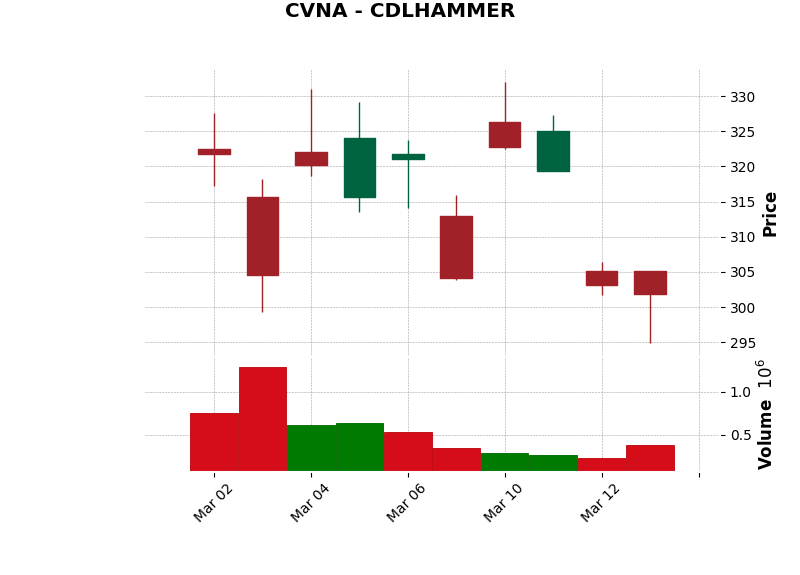 | CVNA | CDLHAMMER | Bullish | Hammer: Bullish reversal. | Buy stock | View Chart |