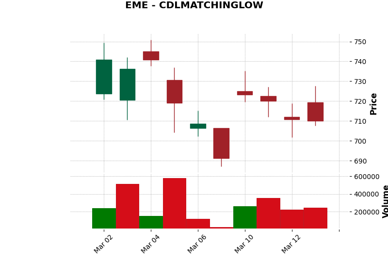 | EME | CDLMATCHINGLOW | Bullish | Matching Low: Bullish reversal. | Buy stock | View Chart |