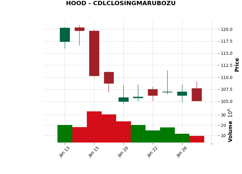 | HOOD | CDLCLOSINGMARUBOZU | Bearish | Closing Marubozu: Continuation pattern. | Hold stock | View Chart |