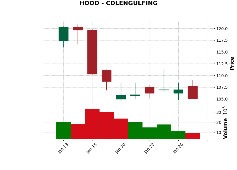 | HOOD | CDLENGULFING | Bearish | Engulfing: Strong reversal pattern. | Watch closely | View Chart |