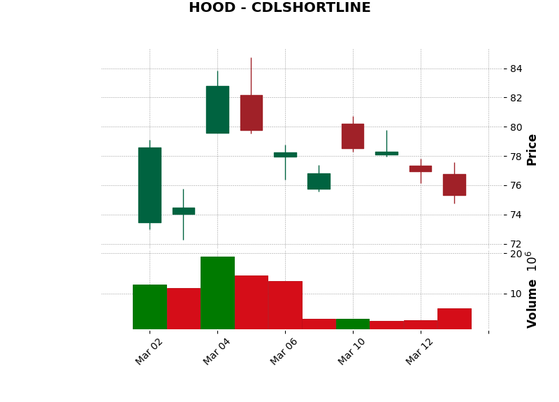 | HOOD | CDLSHORTLINE | Bearish | Short Line Candle: Indicates weak sentiment. | Watch closely | View Chart |