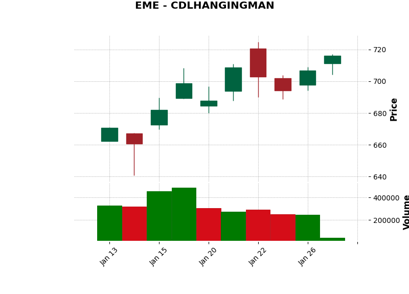 | EME | CDLHANGINGMAN | Bearish | Hanging Man: Bearish reversal. | Sell stock | View Chart |